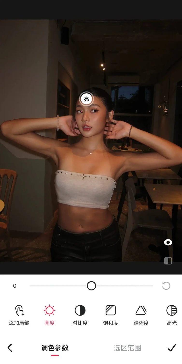局部调色(专业级功能): 点击照片任意位置添加调色点,支持调节该区域的亮度、对比度、饱和度、清晰度、高光、暗部、光感、色温、色调。还可通过【选区范围】控制编辑区域: